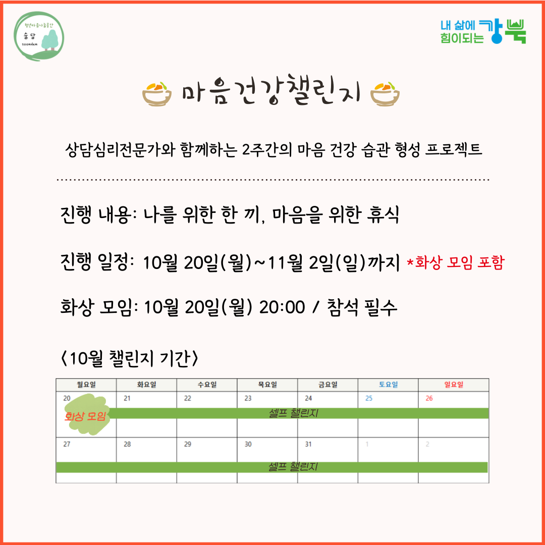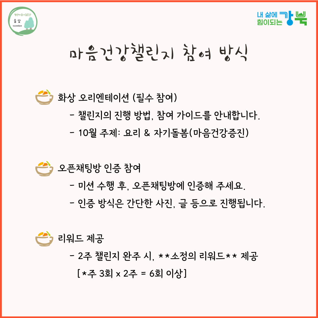 이번 10월 마음건강 챌린지는 ‘요리를 통한 자기돌봄과 마음 회복’을 주제로 진행됩니다.