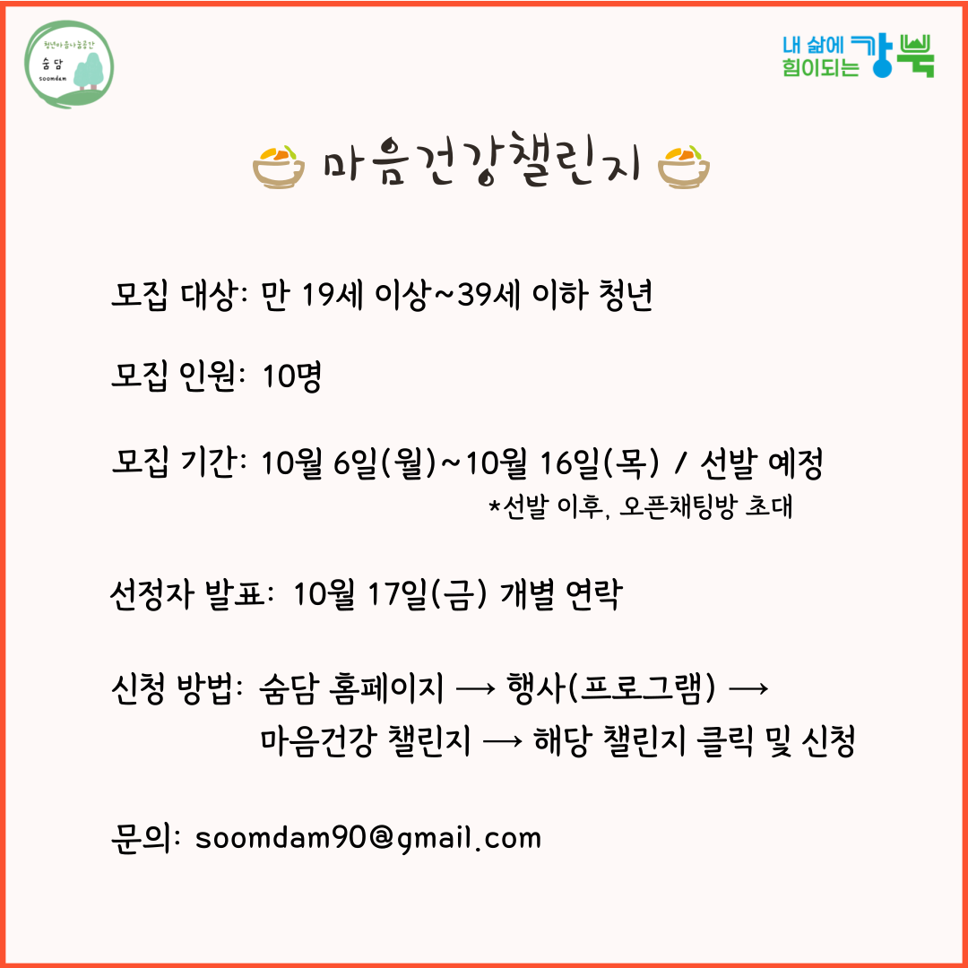 신청 방법: 숨담 홈페이지 → 행사(프로그램) → 마음건강 챌린지 → [해당 챌린지] 클릭 후 신청